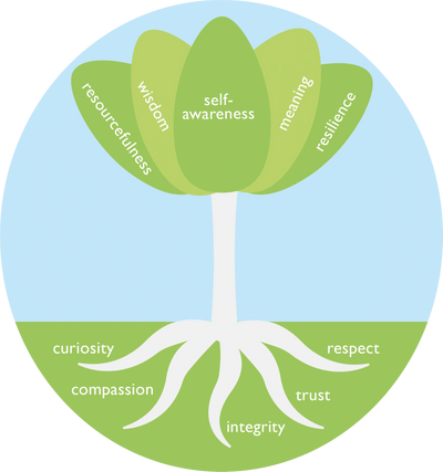 The growth plant illustrates the way we work. The roots show our core values. We aim to provide you with an environment that honours these. Through living our values we foster your ability to grow at your own pace.We anticipate that you will experience an increase of one or more of the ‘petals’: self-awareness, resilience and resourcefulness, wisdom and meaning in your personal and professional life.